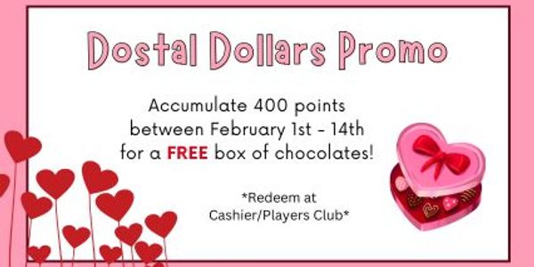 February is Love and we LOVE our customers! Dostal Dollars members accumulate 400 points for a box of chocolates! Give to your loved one or keep for your own indulgence. See cashier/players club for details and restrictions.